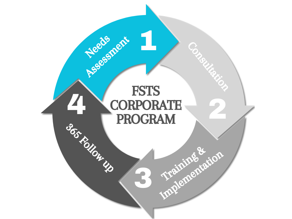 The FSTS Corporate + process provides the comprehensive framework designed to move your organization to the next level. From our Needs Assessment to our 365 Follow up, our team of certified trainers and business consultants will bring you additional success and a Full Spectrum of new opportunities.